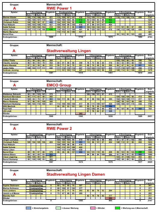 2.2 . Die Mannschaften schreiben die Spielergebnisse gegenseitig auf. Die Mannschaftsführer sind verantwortlich für den Schreibdienst und zeichnen den Spielbericht gegen. Um einen reibungslosen Spielablauf zu gewährleisten, sollen die Mannschaften zehn Minuten vor ihrer Startzeit auf den Bahnen anwesend sein.